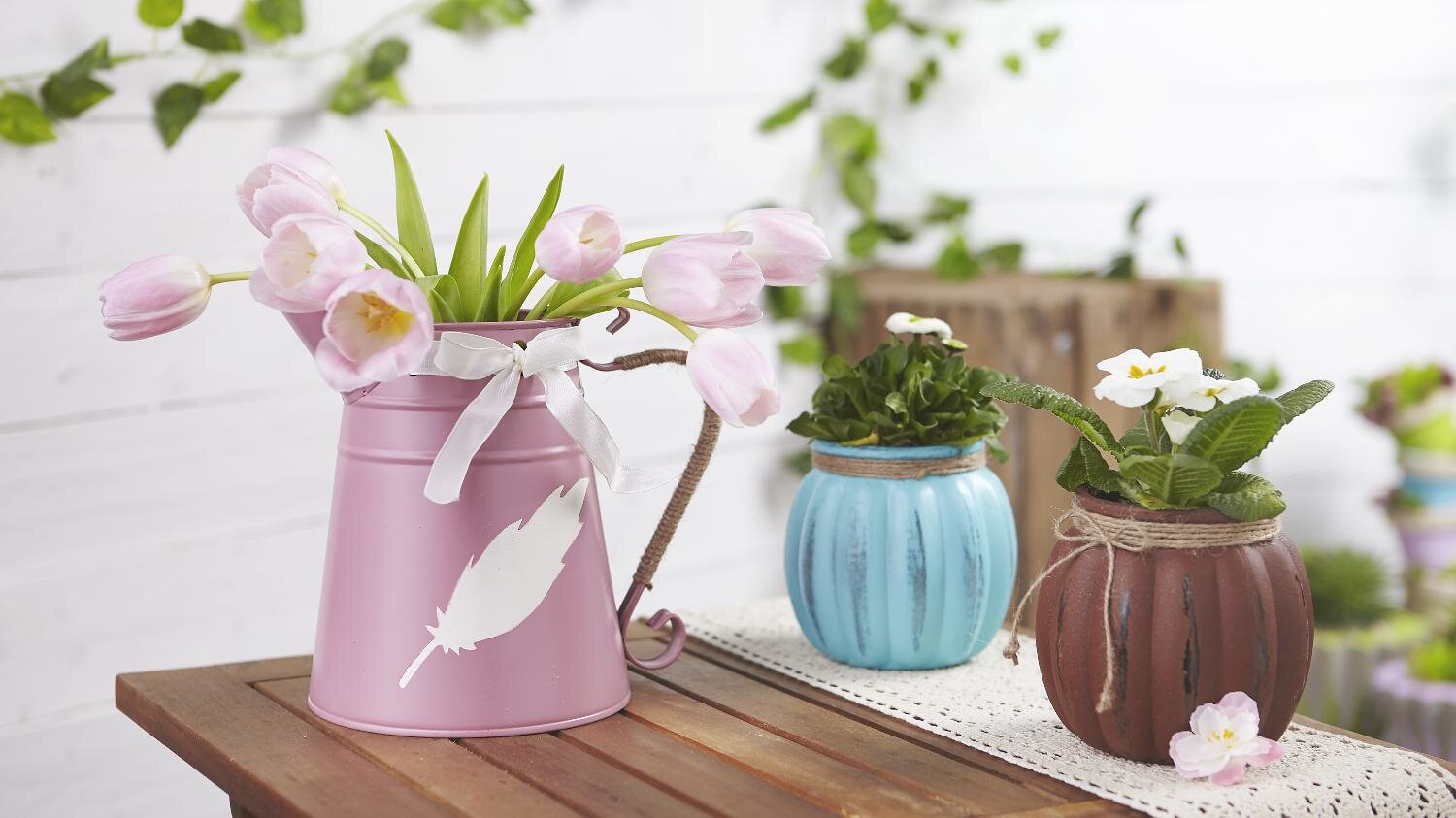 Per il motivo "piuma" sul vaso da fiori, scaricare il nostro modello di motivo. Ritagliare il modello, spruzzarlo con lo spray adesivo e posizionare il motivo sulla brocca. Vasi di vetro