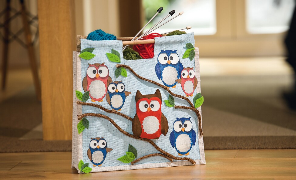 A questo punto si applica spesso il medium di trasferimento tessile trasparente sui motivi, in modo che il tovagliolo sia completamente avvolto dal medium. Dopo 24 ore di asciugatura, il tovagliolo viene rimosso dalla pellicola e i motivi vengono ritagliati. Ritagliare gli occhi e la pancia o le ali del gufo in tessuto 3D.