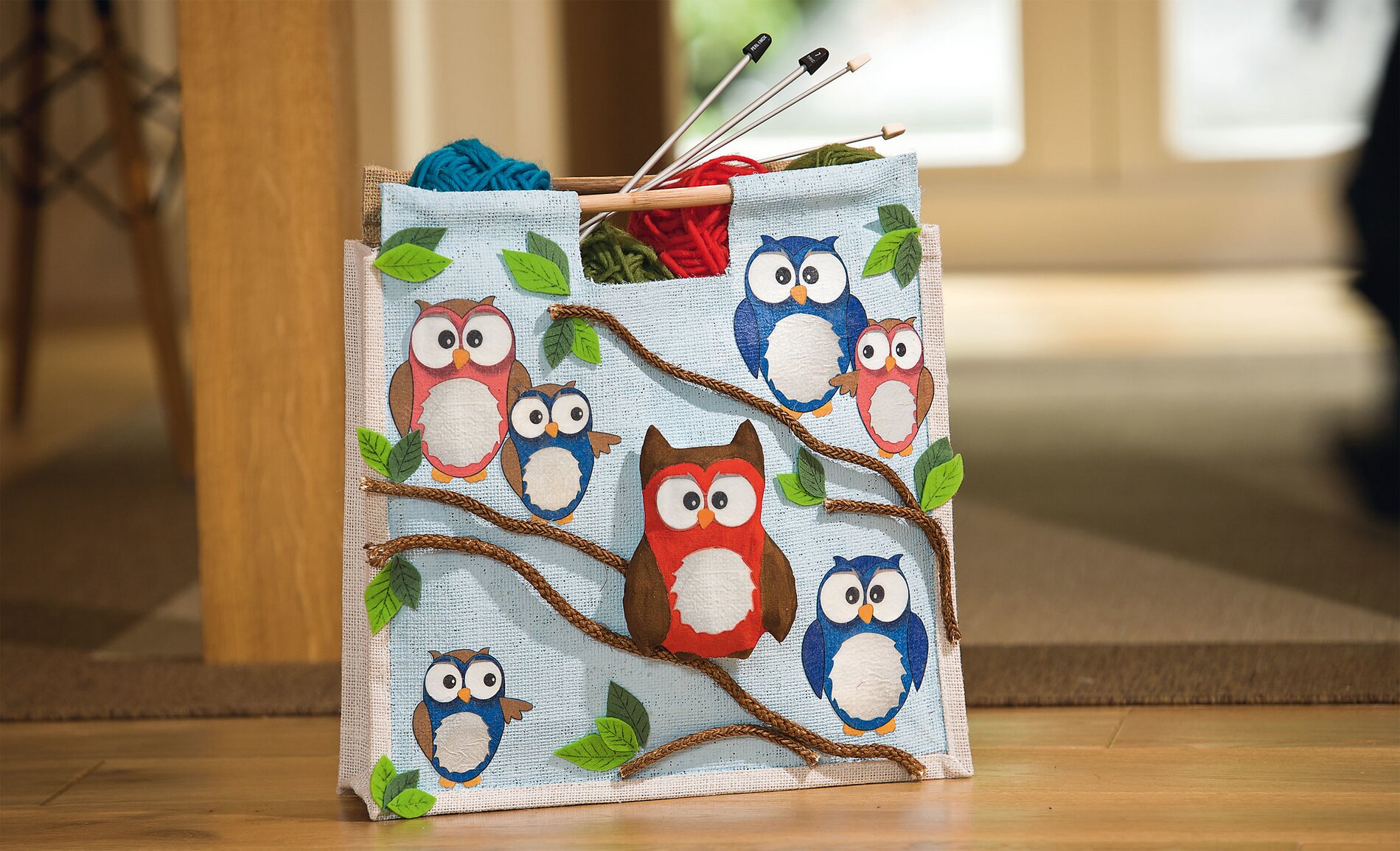 Colorare il sacco di juta con Marabu Textil plus, il filo per i "rami" in marrone. Realizzare un modello per le foglie in 2 dimensioni da un cartoncino fotografico, trasferire i contorni delle foglie su feltro verde chiaro e verde erba e ritagliare. Colorare le venature delle foglie con il pennarello.