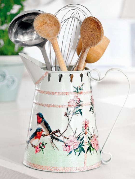 Le zangole per il latte sono un accessorio popolare nell'arredamento delle case di campagna. Si possono usare meravigliosamente come vaso con i fiori freschi del giardino o come supporto decorativo per gli utensili da cucina in cucina. Decorata con questo fresco motivo naturale, questa brocca diventerà presto indispensabile nella vostra cucina in stile country.