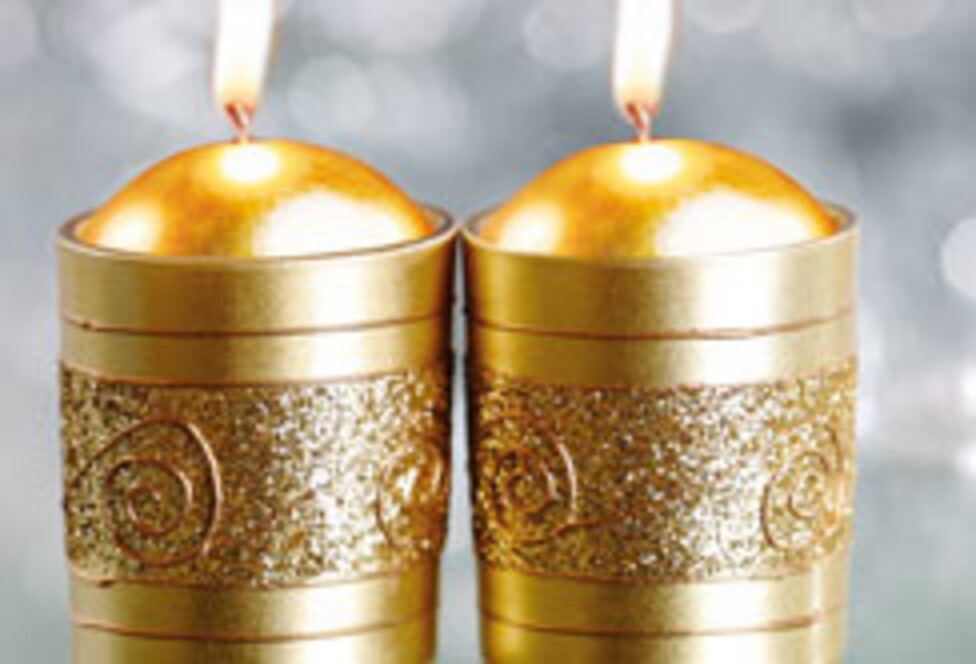 Tagliate i fogli di cera a misura e scaldateli tra le mani. Ora posizionateli intorno alla candela e premete leggermente i fogli. Formate delle spirali con le strisce di cera e procedete come per i dischi di cera. Riempire gli spazi intermedi con il rivestimento per candele in oro glitterato. Dipingere le estremità libere con il rivestimento per candele color oro.