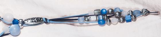 Prendete due cordoncini in similpelle colorata della lunghezza desiderata e infilate le estremità dei cordoncini in una perlina metallica. Infilate ora due perle del "Set di perle, smerigliate" e collegate i due cordoncini facendoli passare attraverso una piccola perla metallica. In questo modo si crea uno spazio libero tra le perline senza che queste scivolino.