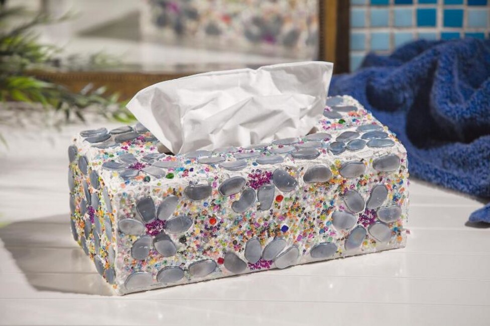 Grazie a questa prestigiosa confezione, non sarà più necessario nascondere i fazzoletti e le veline per il viso. La grande scatola di legno, decorata con mosaici e perline, è a portata di mano nel bagno. La base può essere estratta, facilitando il riempimento della scatola dal basso.