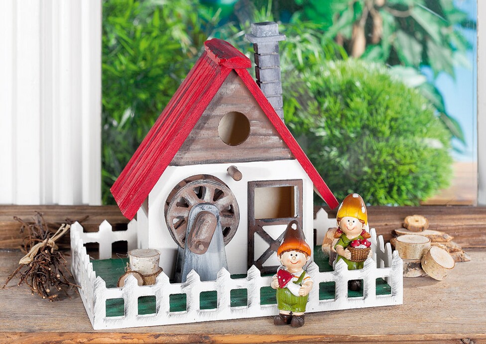 Incollare i pioli di legno in dotazione al mulino e al camino con un po' di colla per legno. Innanzitutto, verniciare di bianco la casa e la staccionata. Una volta asciutto, dipingere il tetto di rosso e la piastra di base di verde. Dipingere il camino e il supporto del mulino in grigio e dipingere il mulino, la porta e la metà superiore della casa con una miscela di marrone e bianco. Per ottenere un effetto legno, passare un po' di vernice nera. Utilizzare una spugna umida e vernice nera per dare un effetto legno al tetto della casa e alla recinzione.