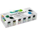 Il Magic Marble Set "Basic Colours" è adatto per la marmorizzazione ad immersione di vetro, legno, plastica, carta, metallo, terracotta, polistirolo e candele. Il set è composto da sei colori: Bianco, giallo sole, rosso, blu, verde e nero.