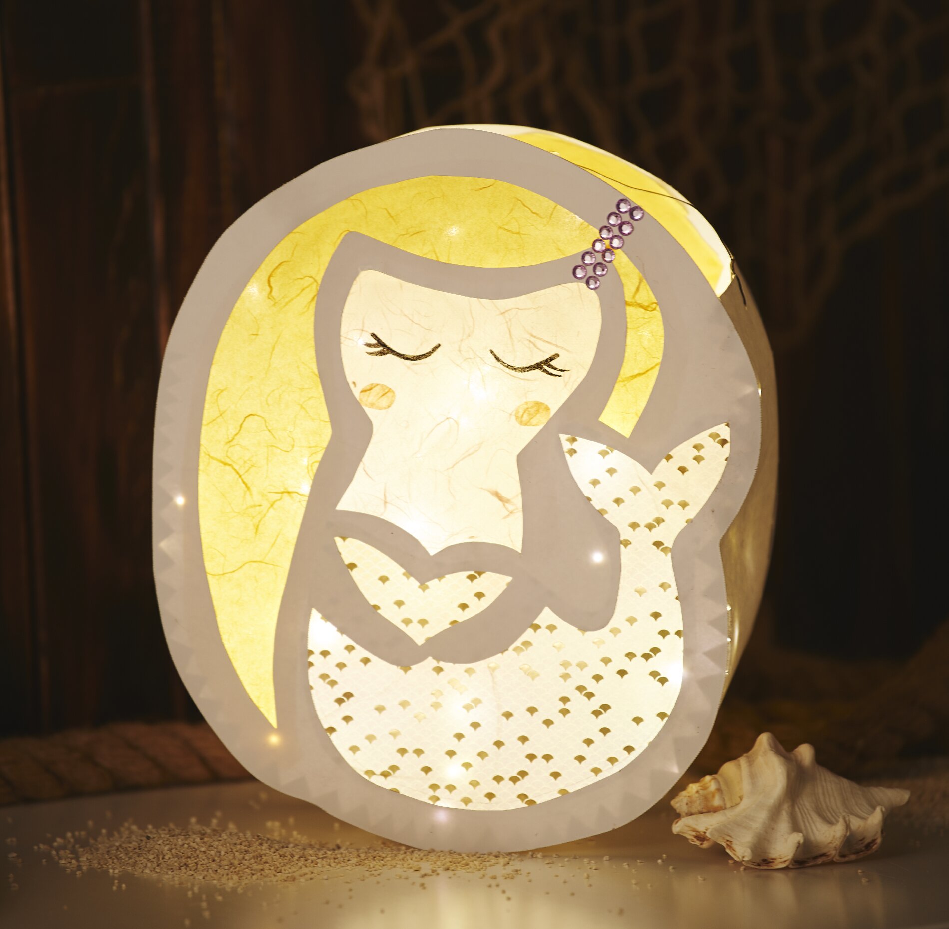 Ora stampate il centrotavola, trasferite la sagoma su un cartoncino (lungo circa 50 cm) e ritagliatelo. Piegare i rebbi verso l'interno e attaccare il pezzo intermedio alla sirena con la colla artigianale. Ora attaccate del filo di ferro alle estremità del pezzo intermedio, in modo che funga da supporto per la lanterna. Per farlo, è sufficiente praticare un foro su ciascun lato con una punzonatrice. Ora posizionate una fonte di luce nella lanterna. A tale scopo, sono adatte sia una luce LED che una stringa di luci LED. Infine, basta fissare un bastoncino per lanterne al filo di avvolgimento e la vostra spettacolare lanterna a sirena è pronta.