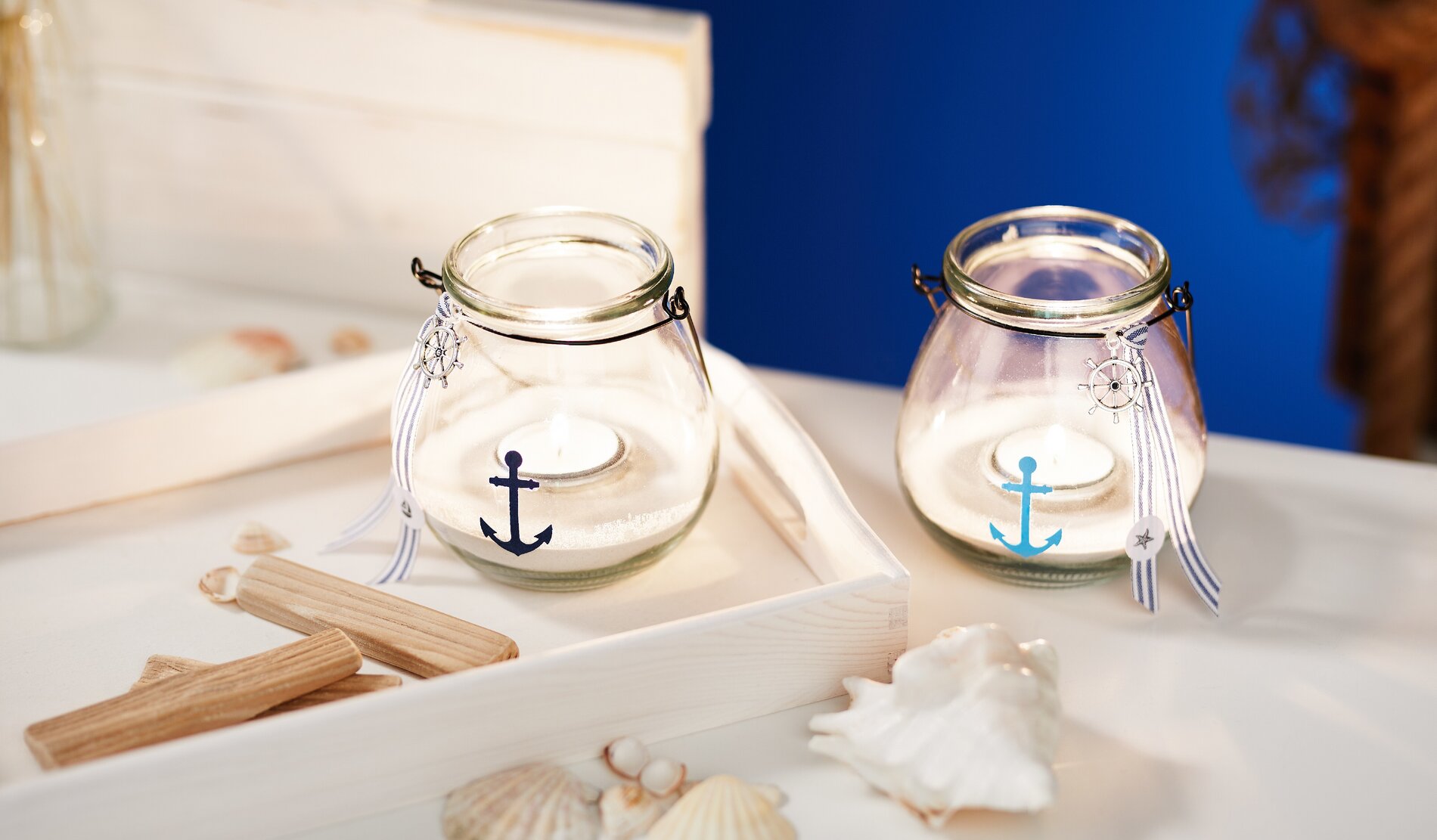 Il primo passo consiste nel ritagliare un'ancora dal cartoncino blu scuro e blu chiaro. Incollatele alle lanterne con un po' di colla artigianale. Poi legare un pezzo di nastro a righe alle stanghette dei bicchieri. Le punte possono essere tagliate ad angolo. Quindi, legare i ciondoli ai bicchieri con il filo di ordito. A questo punto è sufficiente timbrare i cerchi punzonati e incollarli ai nastri.
