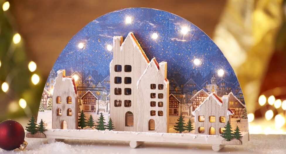 Infine, incollare le case e gli abeti alla base e decorare con neve decorativa e neve diamantata. Naturalmente, è possibile decorare il supporto con altre miniature a piacere.