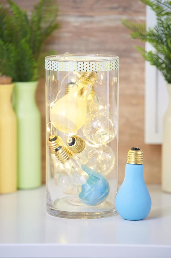 Per colorare alcune lampadine, riempire una lampadina con vernice artigianale gialla e poi farla roteare lentamente in modo che la vernice sia ben distribuita. Ripetere l'operazione con una vernice artigianale blu per ottenere una lampadina bluastra. Nel nostro esempio, abbiamo mescolato