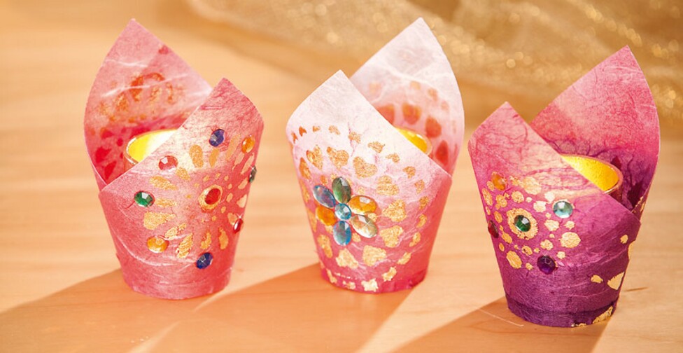 Incollare gli stencil sui bicchieri da tè ottenuti e spalmare un po' di latte per modellare. Importante: pulire subito dopo gli stencil con acqua corrente. Quando il latte di modellazione si è asciugato, dopo circa 30 minuti, applicare la foglia di metallo e strofinare il materiale in eccesso con un pennello a setole fino a quando i motivi incisi sono chiaramente visibili. Dorare allo stesso modo l'intera superficie dei bicchieri per tealight.