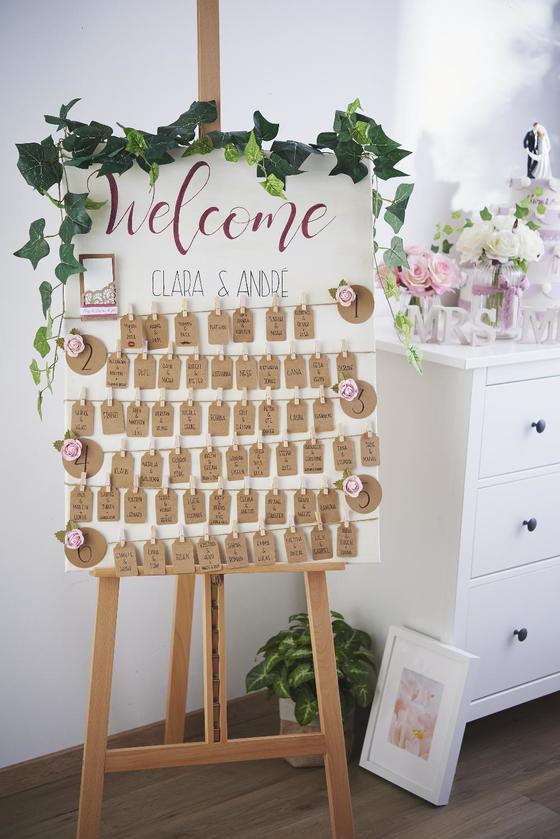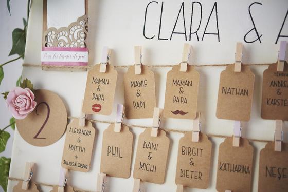 Ogni tavolo è numerato con un numero. Per ogni tavolo c'è una linea tesa di nastro di juta, a cui sono attaccati dei cartoncini per dire agli ospiti chi è seduto dove.