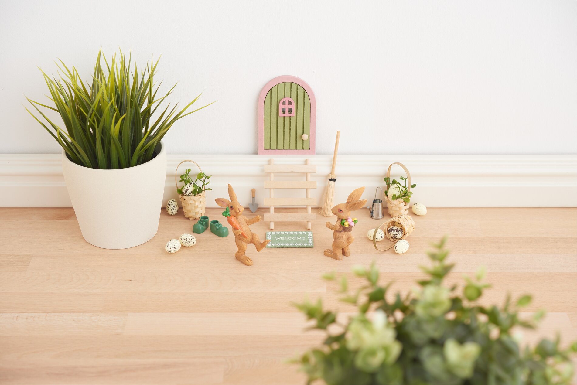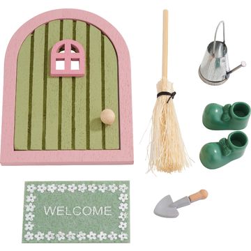 Collochi la porta d'ingresso accuratamente realizzata con la scala su un battiscopa robusto. Disponga il cestino in miniatura e altri elementi decorativi per creare una scena invitante e armoniosa.