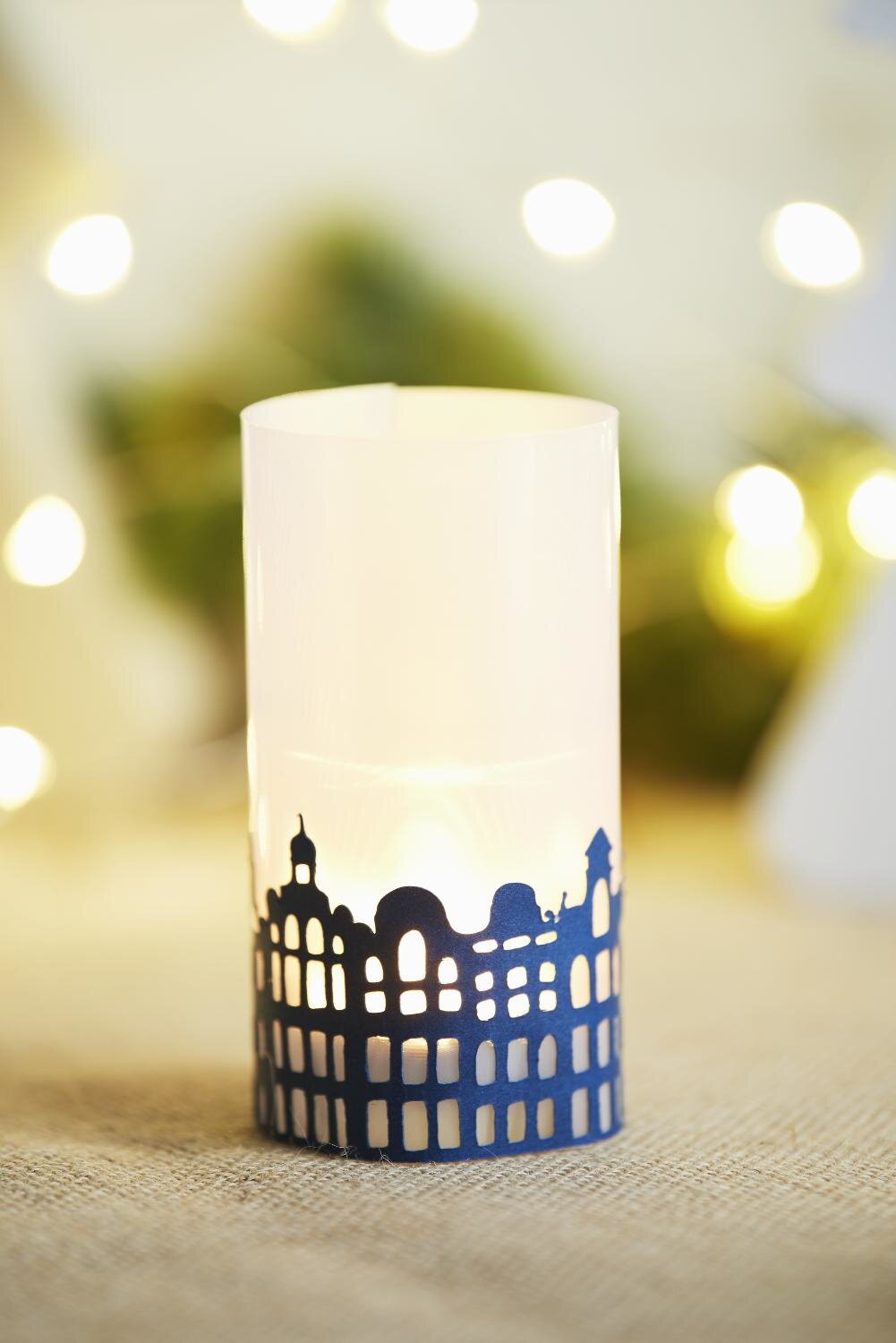 Per la lanterna, abbiamo fustellato la facciata della casa in carta colorata blu, quindi abbiamo posizionato il motivo su un foglio di lampada, l'abbiamo posizionato intorno a una luce da tè e l'abbiamo ritagliato di conseguenza.