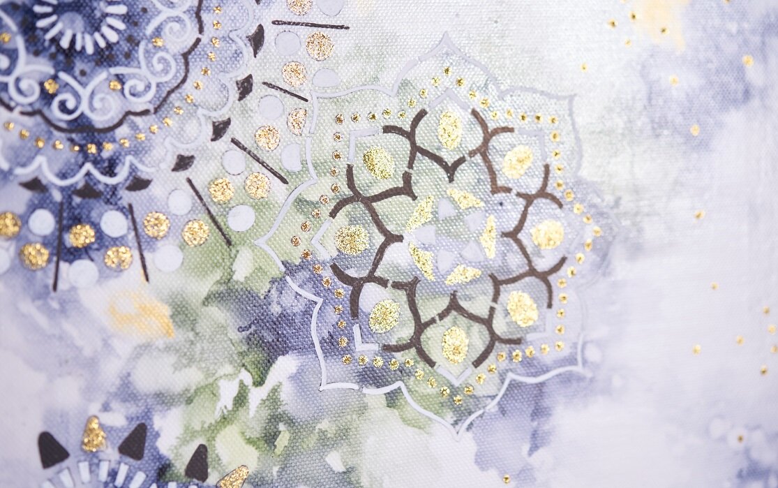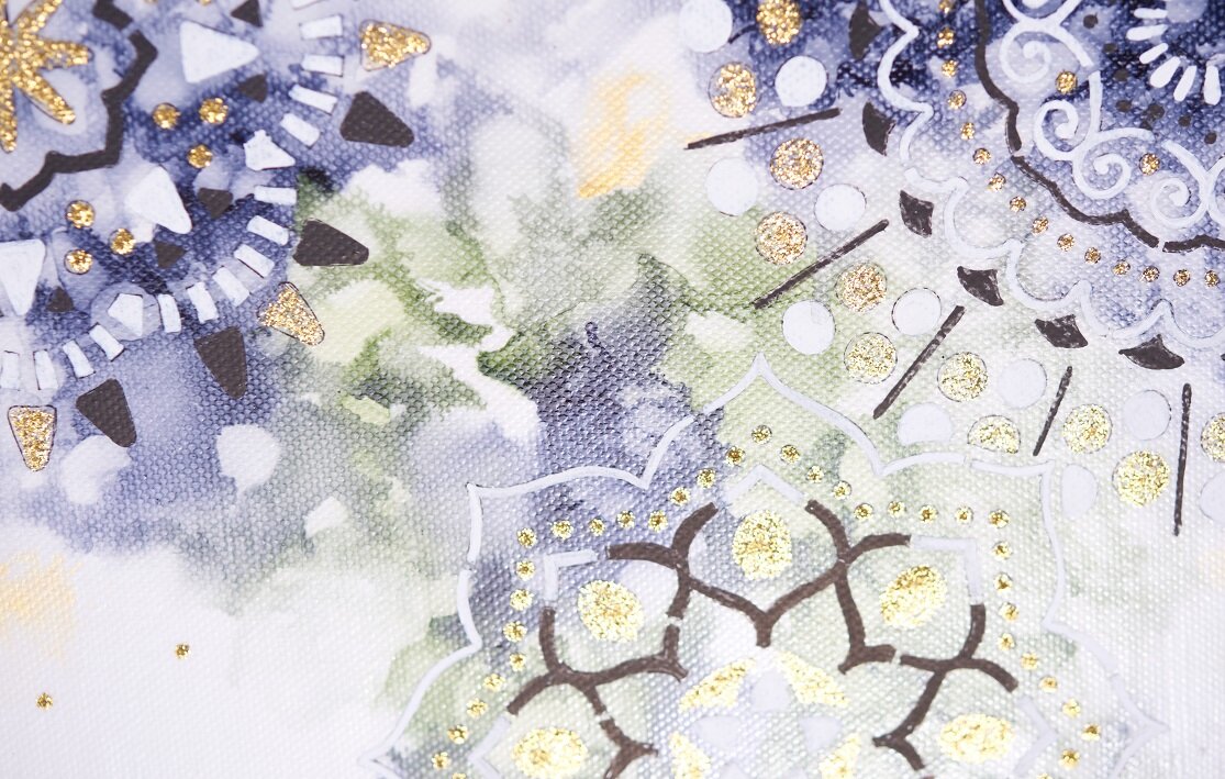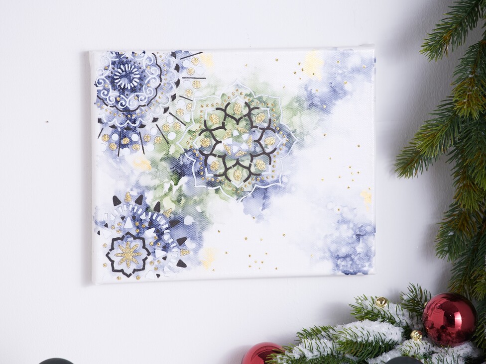 Disegnare la cornice della tela con i colori Alcohol Ink verde oliva e nero e aggiungere accenti dorati con la colla glitter.