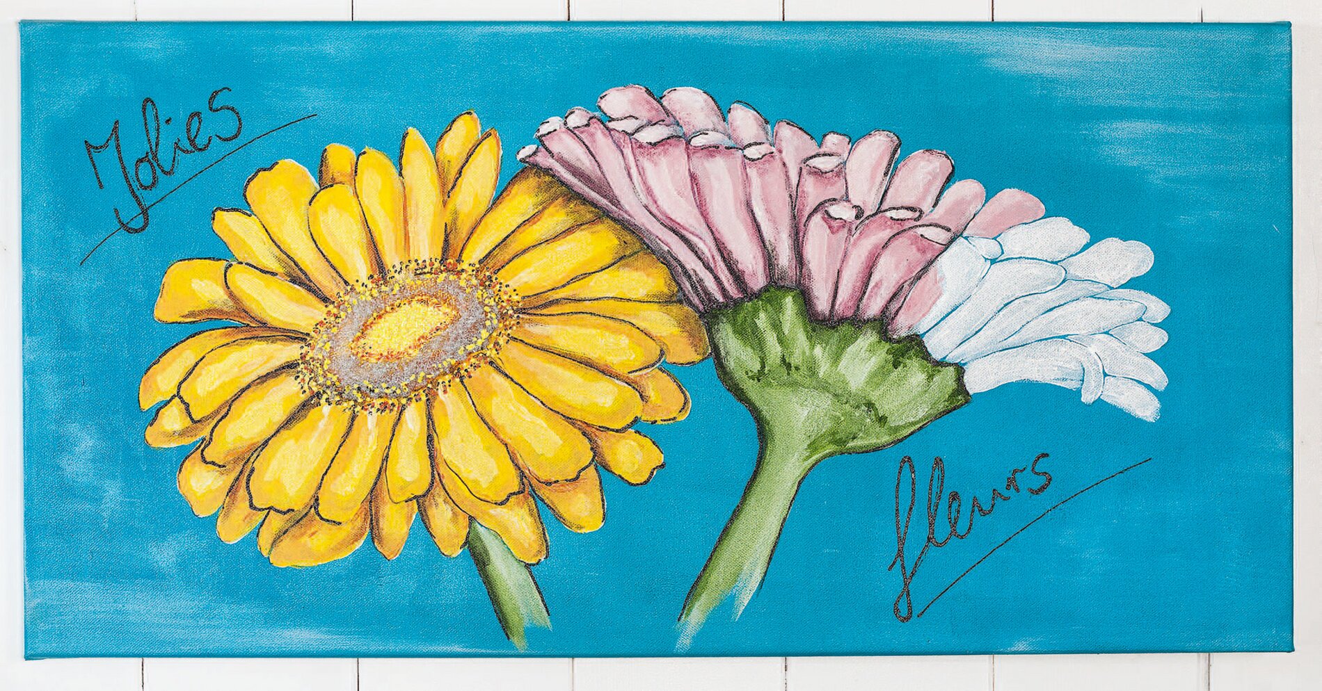 timbri a fiore e cospargere di piccole perle trasparenti. Tamponare la vernice gialla sulle perle esterne e al centro: in questo modo i timbri a fiore avranno un effetto 3D. Tracciate i contorni dei petali con la vernice nera e aggiungete le ombreggiature con la vernice scura! Per ottenere contorni e scritte chiare, si consiglia di riempire un flacone di vernice acrilica nera. In questo modo è possibile tracciare linee particolarmente sottili.
