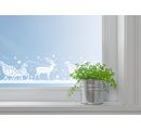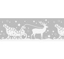 Grande nastro per finestre "Slitta" autoadesivo con una larghezza di circa 7,6 cm e una lunghezza di circa 2 metri. Questo nastro trasparente raffigura una renna con una slitta di colore bianco. La slitta misura circa 7,4 x 5,0 cm e la renna circa 5,0 x 6,1 cm.