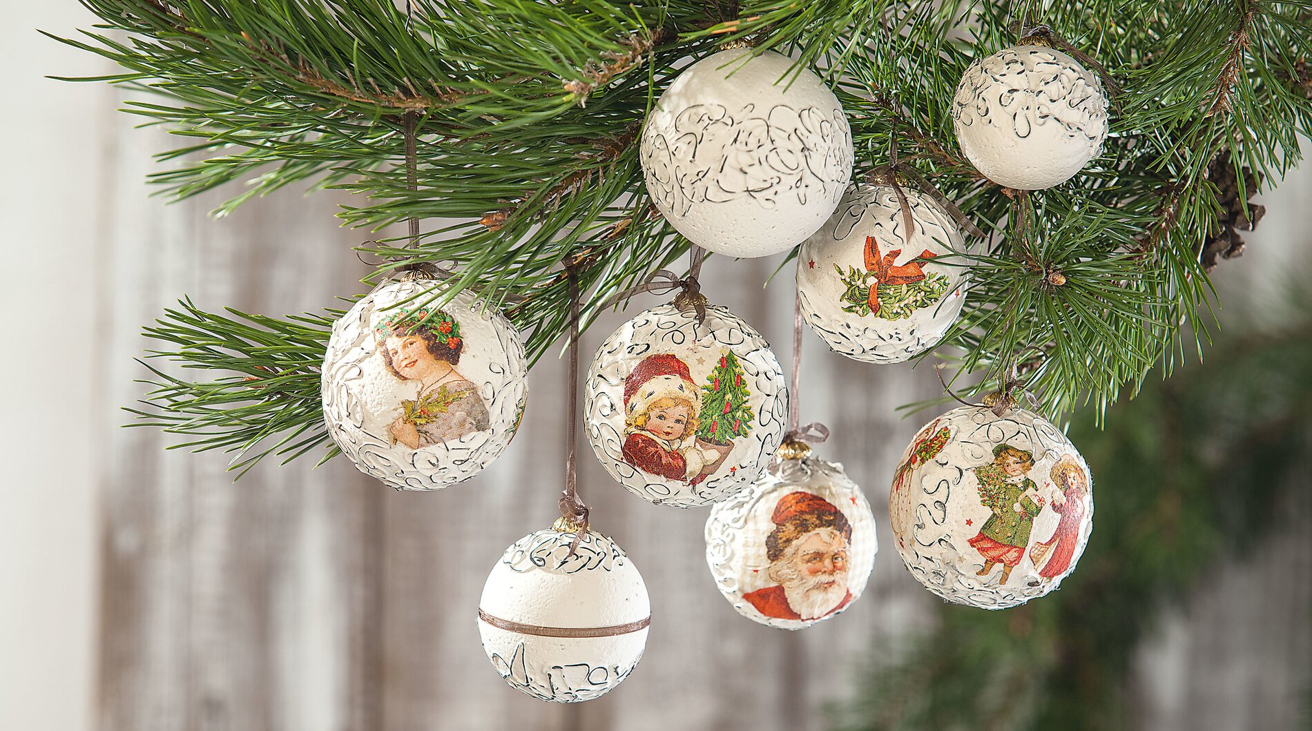 Strappare i motivi dal tovagliolo e rimuovere i due strati di carta bianca. Incollare lo strato stampato sulle aree libere tra i ghirigori 3D con la vernice per tovaglioli. Una volta asciutto, fissare il nastro di organza intorno ai baubles con il nastro adesivo. Infine, infilare le grucce di polistirolo nei baubles e farvi passare il nastro di organza. Con un ago, infilare il nastro nella calotta di perline, annodarlo e fare un piccolo fiocco.