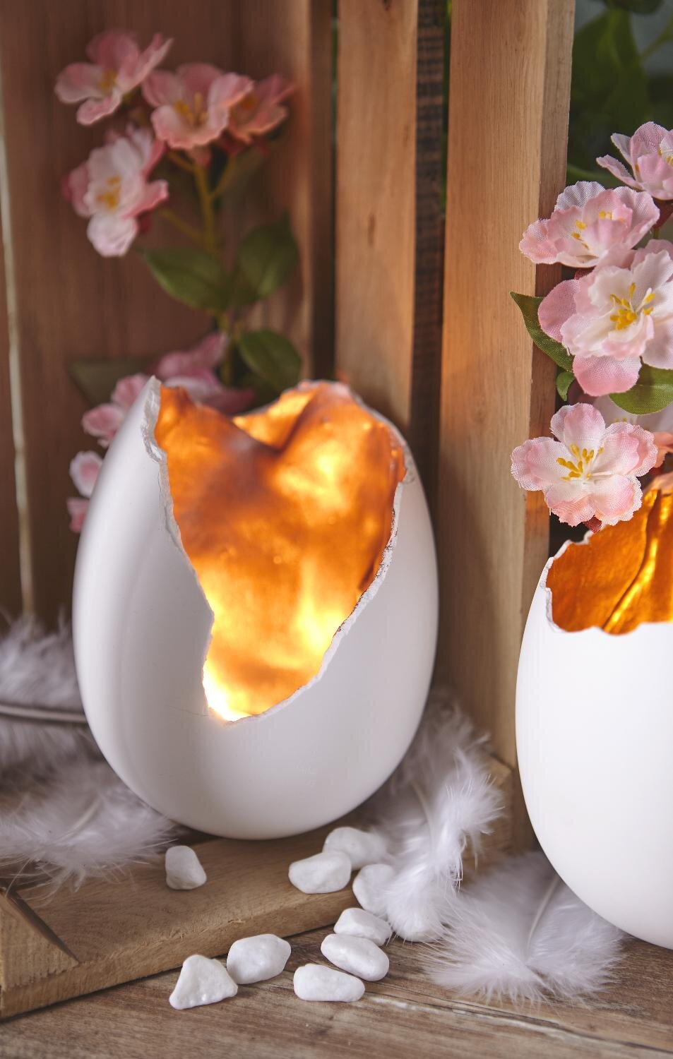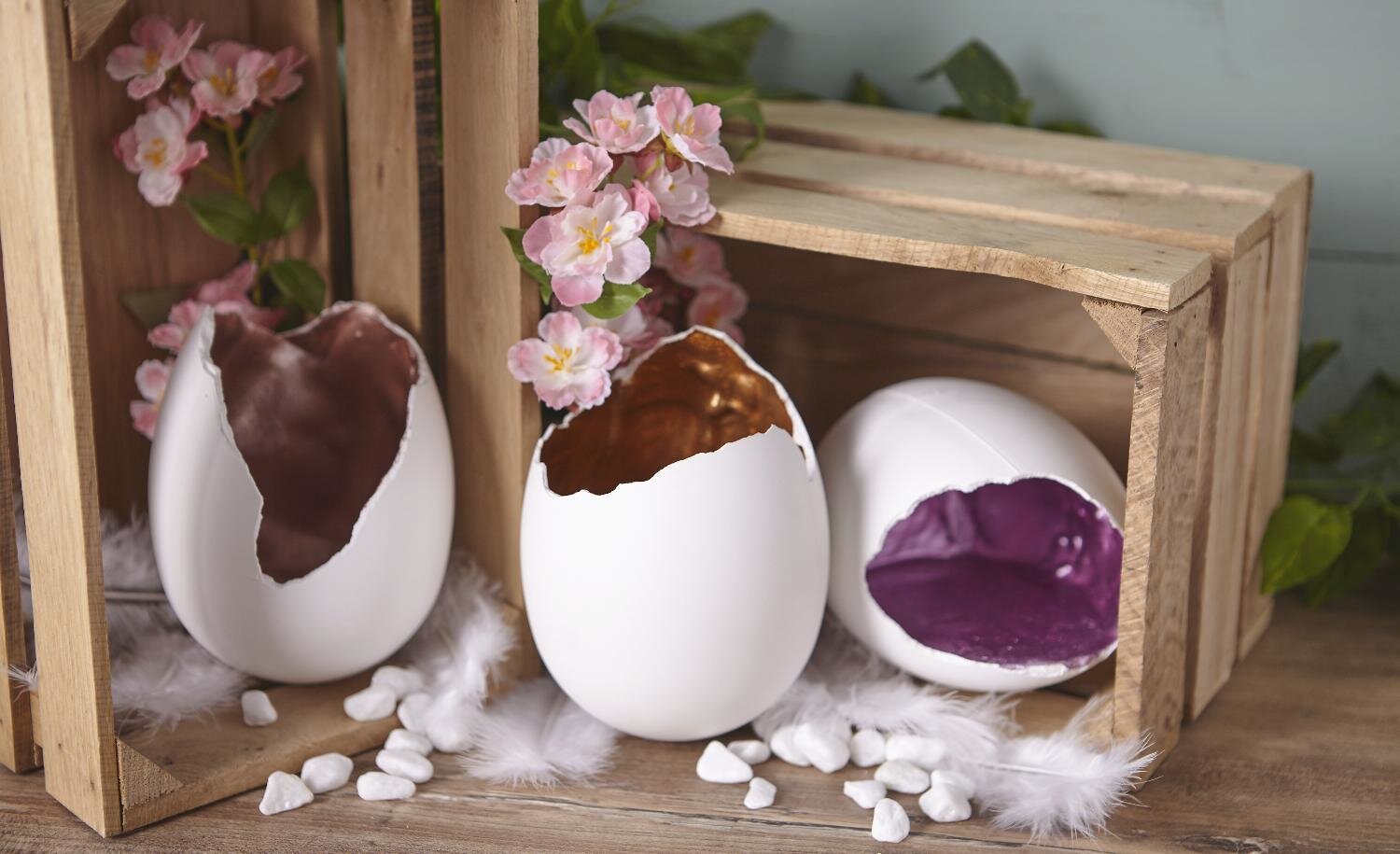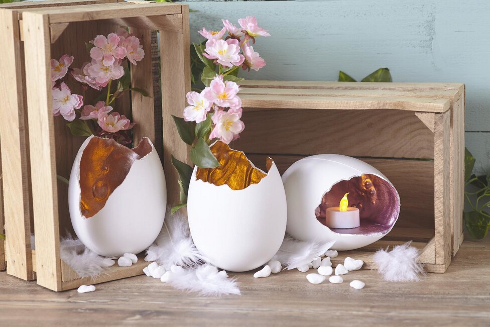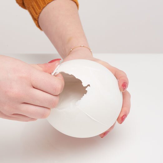 Dopo circa 30 minuti, tutti gli strati del composto di colata si saranno induriti a sufficienza per poter essere rimossi dall'uovo in acrilico. Per staccare l'uovo dallo stampo, battere leggermente lo stampo sul tavolo. Si noterà che l'uovo si divide lentamente. Ora potete rompere i bordi, se necessario, per rendere le uova di dinosauro ancora più accattivanti.
