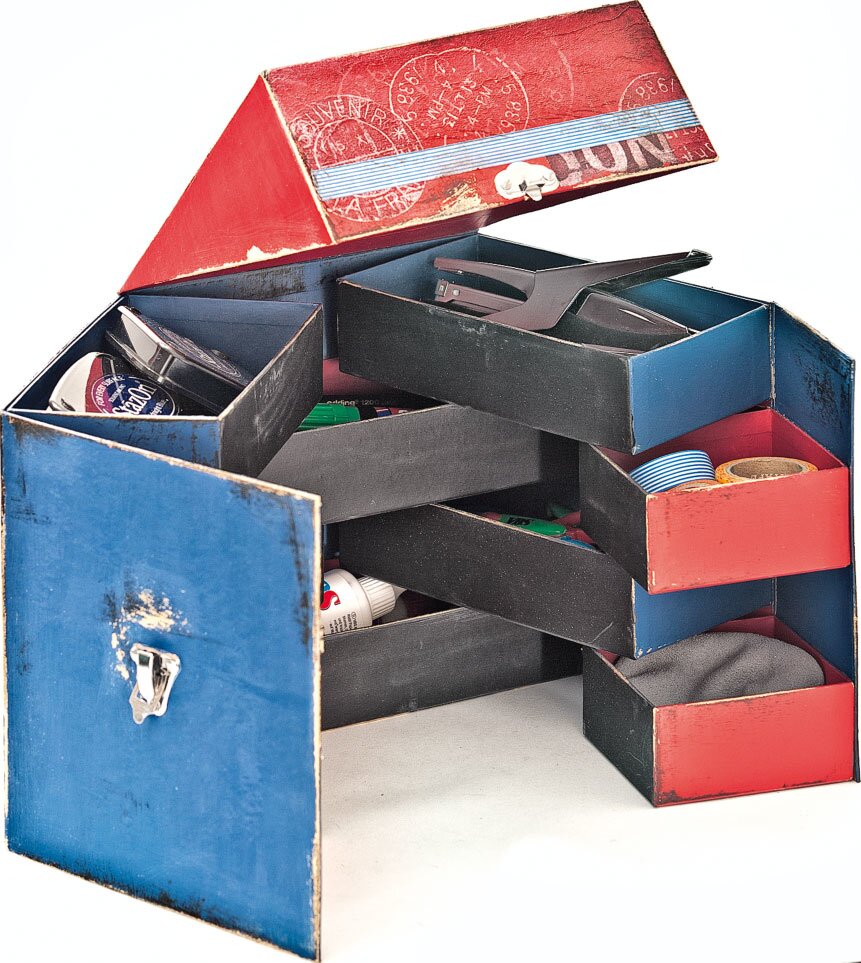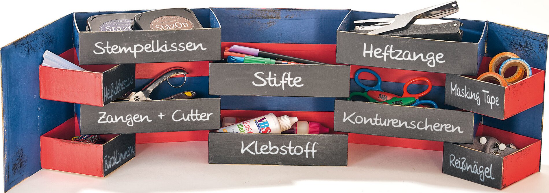 Colorate la scatola di rosso e blu secondo i vostri gusti. Una volta asciutta, dipingete le facciate dei singoli scomparti 2 - 3 volte con la vernice per lavagna. Applicate una mano di vernice grigia sul coperchio e, dopo l'asciugatura, dipingetelo d'argento.