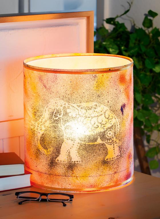 Decorate la lampada con il nastro di raso, che fisserete al bordo superiore con il nastro, e con alcuni strass, che potrete incollare sul motivo e intorno ad esso.