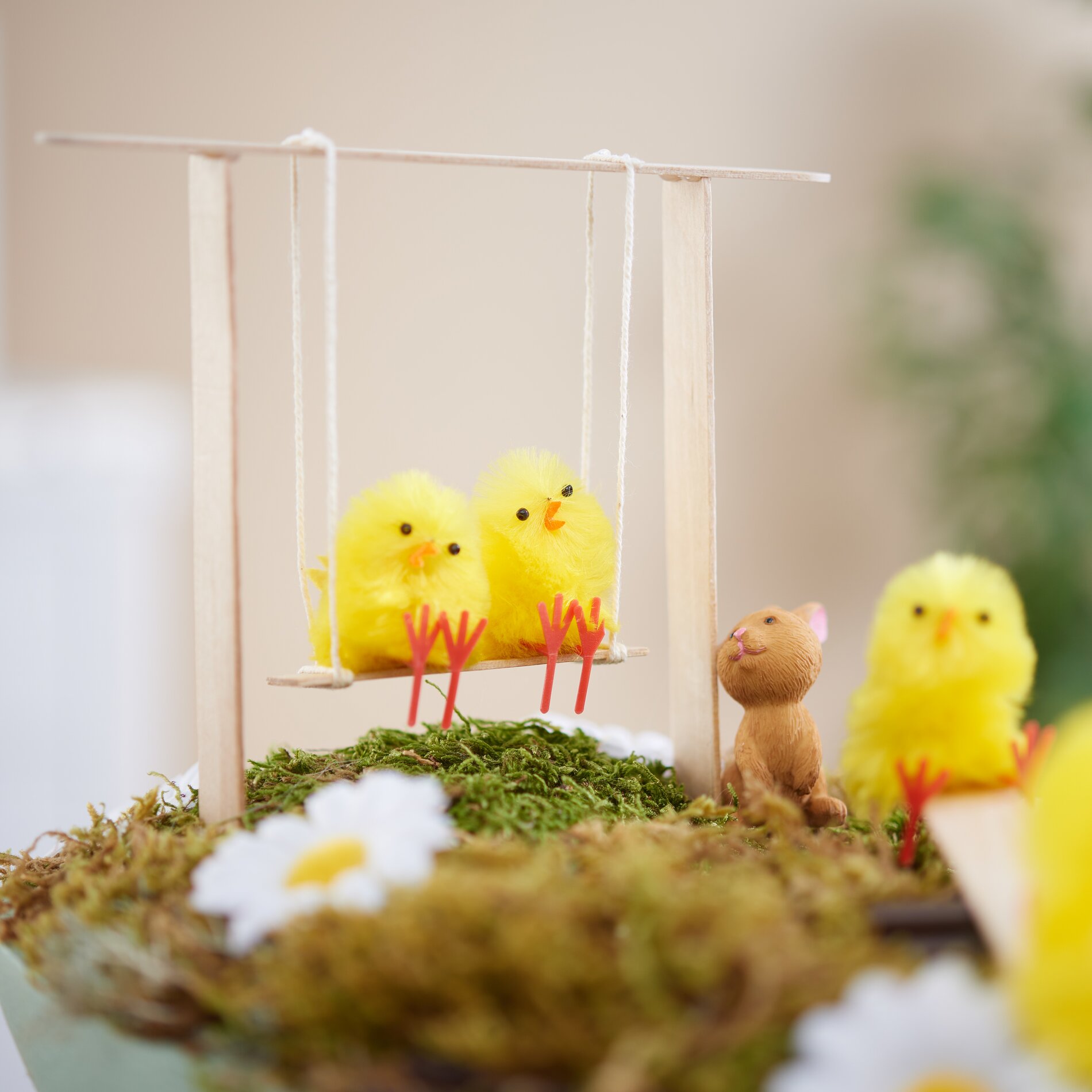 Ricoprite completamente l'altra metà dell'uovo con il muschio e fissatelo con la colla a caldo. Costruire un'altalena e un' altalena con spatole di legno e filo. Incollate con la colla a caldo i pulcini di ciniglia sull'altalena e sull'altalena. Aggiungete fiori di margherite e coniglietti al muschio con la colla a caldo. Infine, attaccate la sezione di recinzione al bordo della metà dell'uovo come "scala di corda".