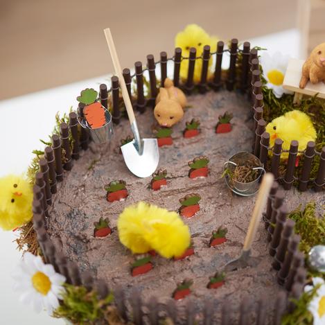 Riempire l'interno delle uova con la schiuma floreale, tagliata a misura con un coltello da taglio per creare una superficie piatta. Utilizzate una spatola di plastica per spargere la neve decorativa per il futuro orto. Usate la spatola per formare delle file in cui verranno poi posizionati i pezzi di carota sparsi. Lasciare asciugare e poi dipingere con la vernice artigianale VBSgrigio-marrone e nera. Incollare i pezzi di carota sparsi nell'aiuola e incollare intorno ad essi la staccionata in legno tondo VBS. Rifilare l'estremità della staccionata con un taglierino. Fissare il muschio con la colla a caldo e attaccare gli attrezzi da giardino, le figure e i fiori di margherita con la colla a caldo.