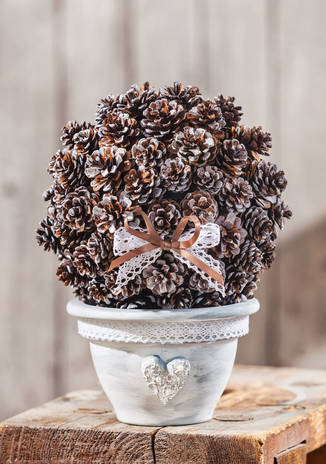 Una volta asciutte, punteggiare le pigne con la colla a caldo e incollarle una vicino all'altra nella palla fino a ricoprirla completamente.