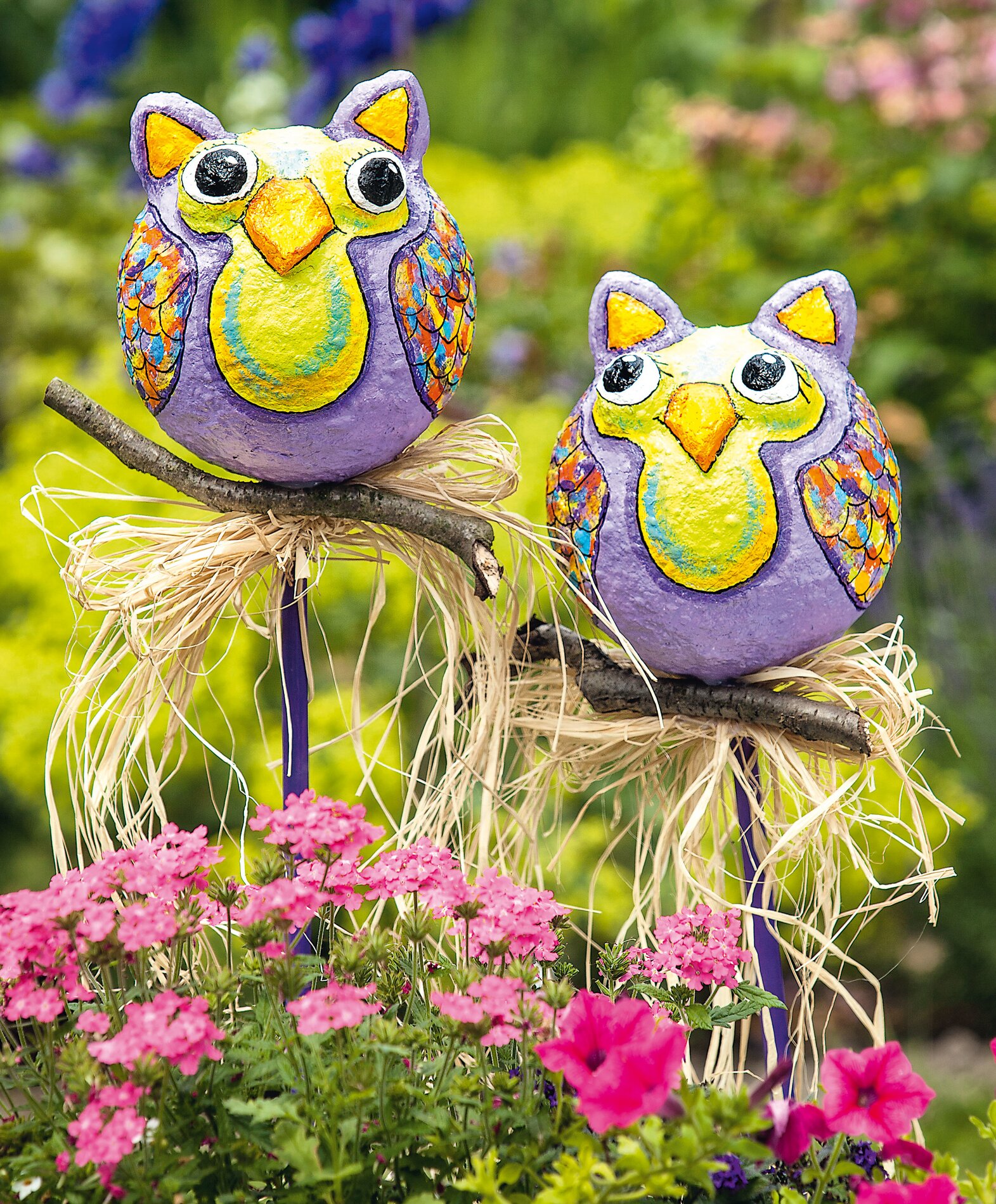 I gufi sono i preferiti di sempre per le decorazioni da giardino. Questi due coloratissimi esemplari sono modellati in cartapesta su grandi sfere di plastica e dipinti con colori resistenti alle intemperie. Un allegro tocco di colore per il vostro giardino!
