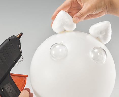 Fissare la pallina al bastoncino rotondo con la colla a caldo. Incollare sulla palla due semisfere per gli occhi e due cuori di polistirolo per le orecchie di piuma.