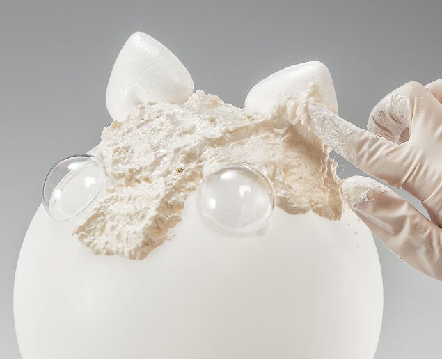 Mescolare la cartapesta secondo le istruzioni e applicarla in modo uniforme, modellando il becco direttamente sulla palla. Lisciare le zone irregolari e le crepe con un po' d'acqua, quindi lasciare asciugare bene l'impasto per circa 48 ore.