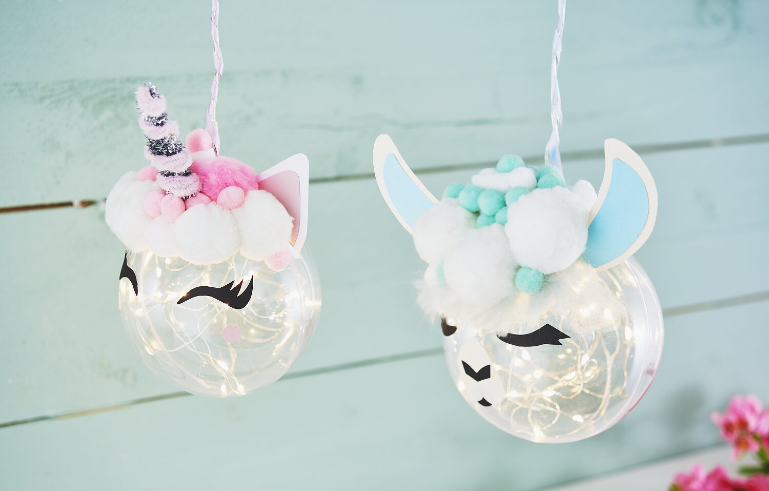 Ora incollate gli occhi, le orecchie e le bocche alle palline in acrilico con il nastro b iadesivo. Attaccate la soffice criniera dell'alpaca, che è fatta di cotone idrofilo, con un po' di colla a caldo. Quindi posizionare i pompon sulla testa come desiderato. Per il corno scintillante, intrecciare un filo di ciniglia e attaccarlo alla testa dell'unicorno con la colla a caldo. Quindi posizionare i pompon sulla testa e incollarli.
