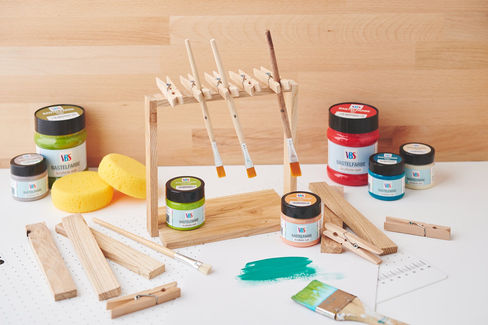 Per dare al portapennelli fatto in casa il tocco finale e proteggerlo al tempo stesso dallo sporco, applicare la vernice acrilica VBS sulla piastra di base e sui due blocchi laterali del supporto. Questo strato rende il portapennelli pulibile e lo protegge dalle sfide della creatività quotidiana.