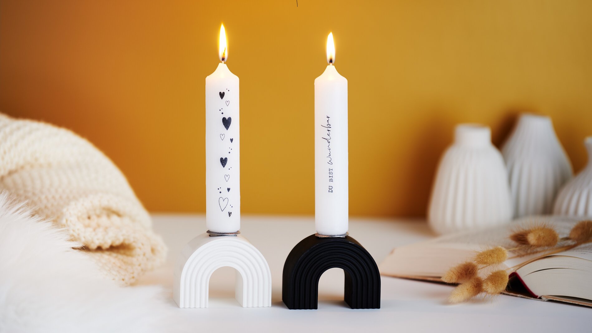 Non sono belli i candelieri a forma di arcobaleno? Con le candele abbinate con bellissimi motivi e scritte, sono un punto di forza decorativo nelle vostre quattro mura e anche un'ottima idea regalo. I portacandele sono realizzati con la tecnica di stampaggio di tendenza. E il punto forte: il composto di stampaggio è ora disponibile anche in nero! Il portacandele nero si integra perfettamente con il supporto bianco.