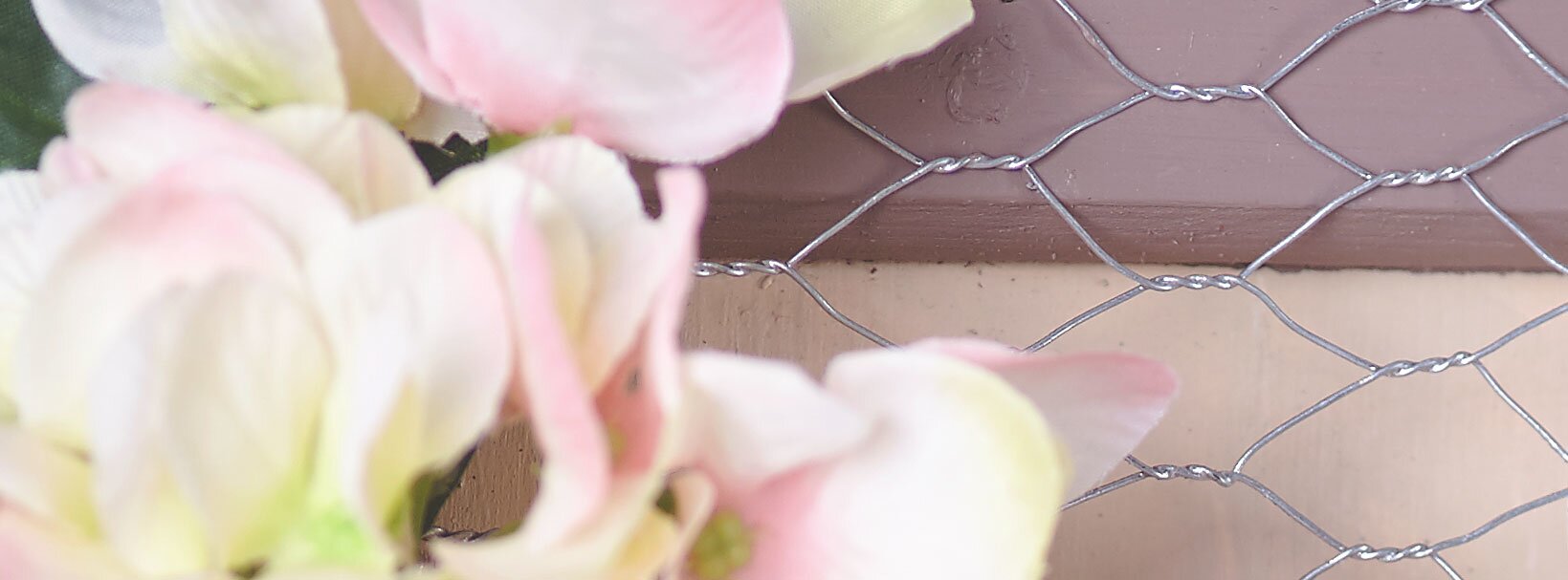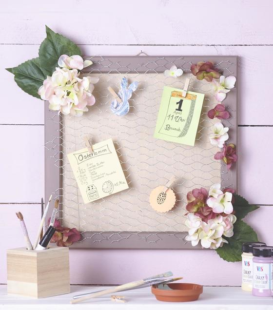 Filo di ferro della dimensione della cornice (circa 36 x 36 cm) e fissarlo alla cornice: è facile e veloce con la colla a caldo o con la pinzatrice. Decorate la nuova lavagna con fiori di ortensia.
