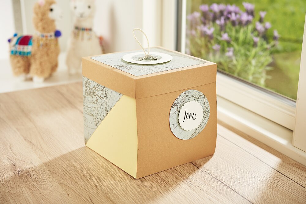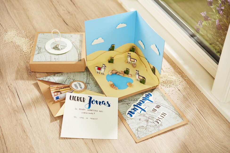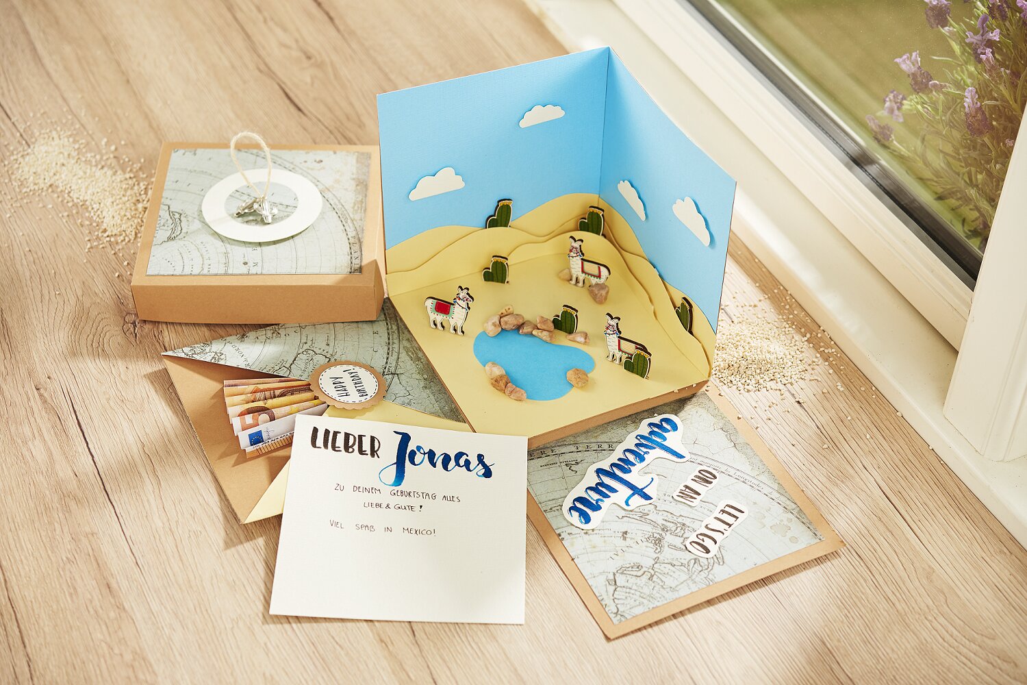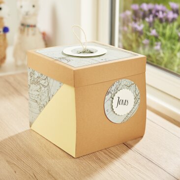 Siete alla ricerca di un'idea originale per un regalo in denaro? Questa scatola esplosa offre un'incredibile quantità di spazio per le vostre idee creative. Oltre agli elementi decorativi coordinati, c'è spazio anche per gli spiccioli necessari per un viaggio.