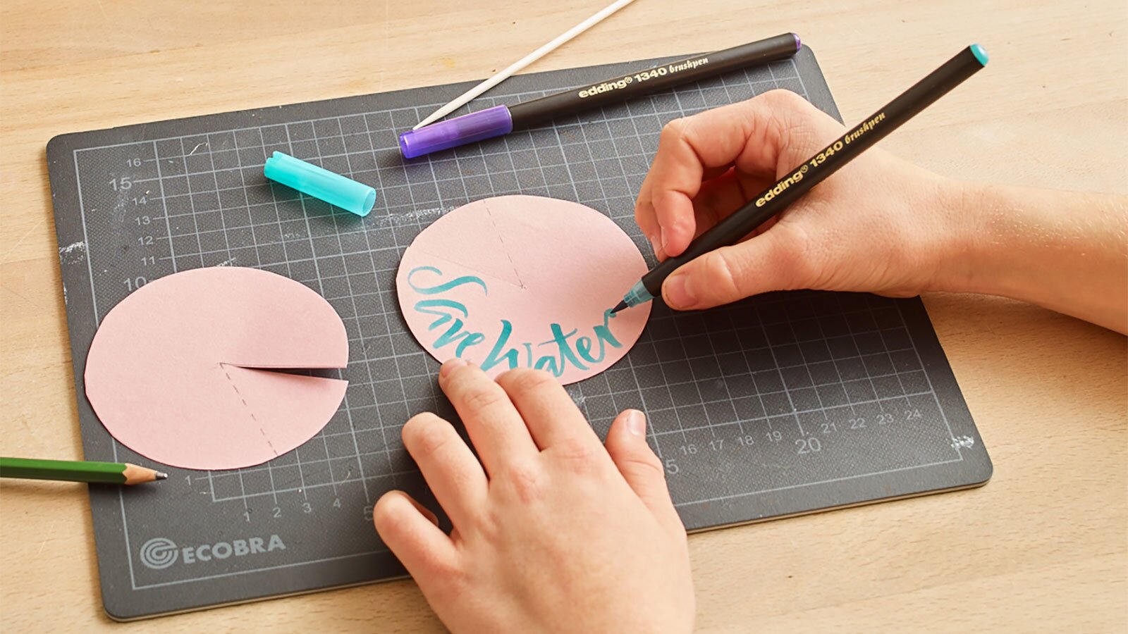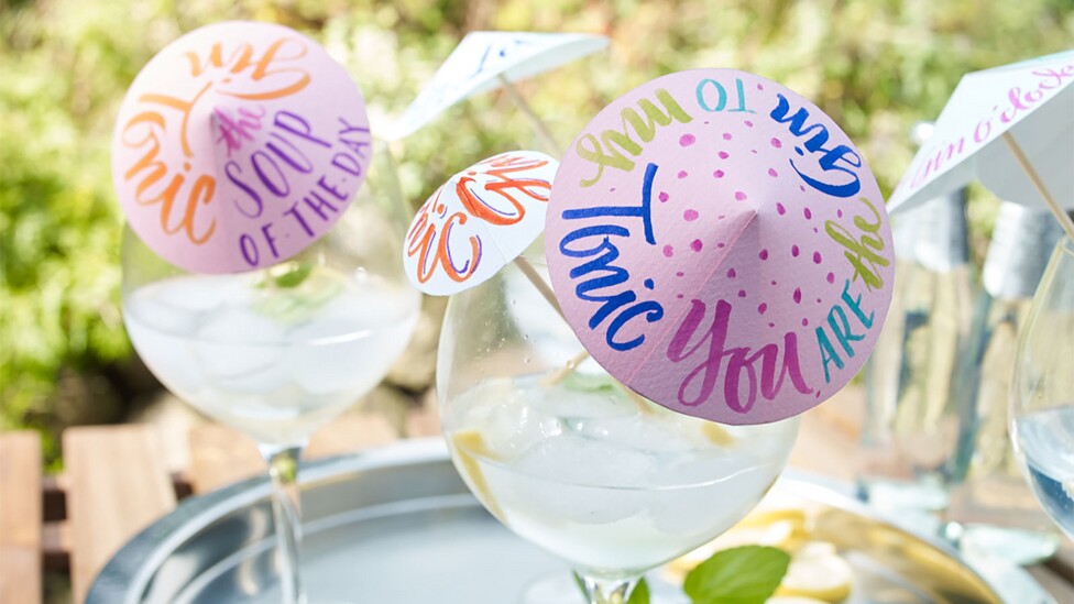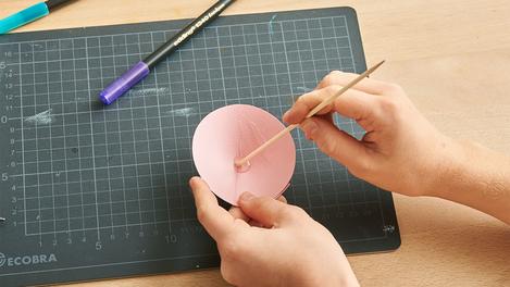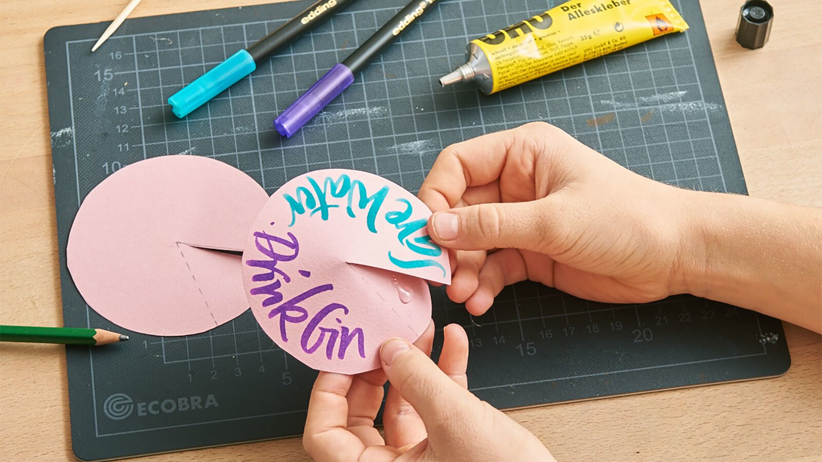 Per gli ombrelli, disegnare sulla carta cerchi di circa 8 cm di diametro con un compasso e ritagliarli. A questo punto, potete abbellire l'ombrello con una frase o un disegno divertente utilizzando i pennarelli Edding. Assicuratevi di lasciare libera una piccola parte del cerchio; potete tracciare due linee guida con una matita. Una volta decorato l'ombrello, tagliate i cerchi fino al centro e incollate le estremità l'una sull'altra per creare un cappellino.