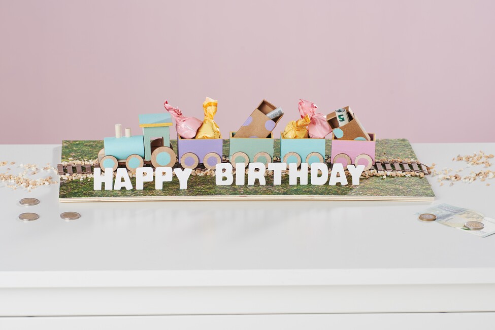 Infine, posizionate il treno sui binari. A questo punto si possono usare le lettere per creare una scritta personalizzata e fissarla con la colla per artigianato.