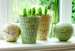 Trasferite le scritte e i motivi sui vasi di argilla e sulle palline decorative utilizzando la carta autocopiante e una matita. Infine, tracciare i motivi con il pennarello opaco Edding 4000.