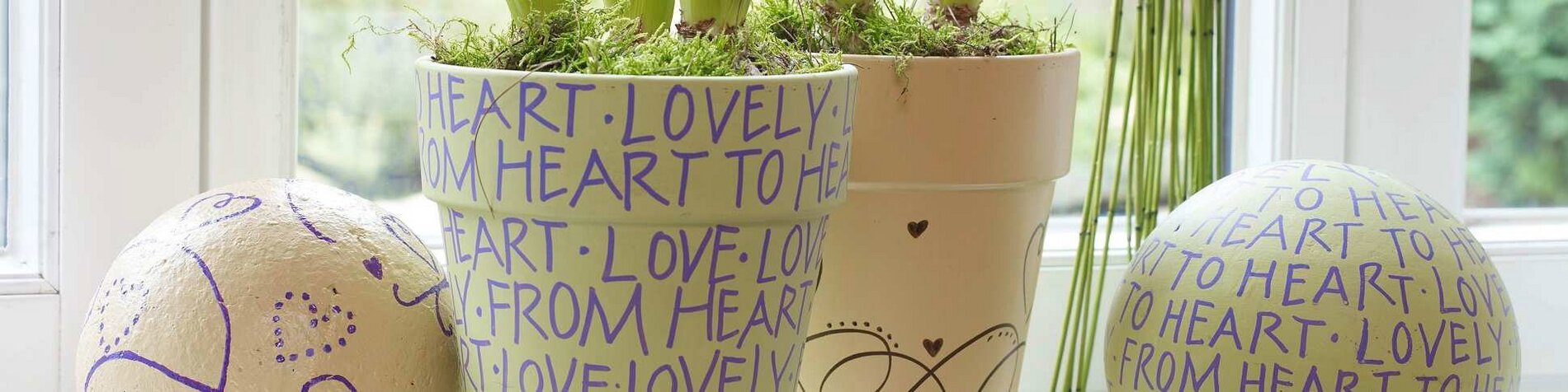 Per prima cosa, spruzzate i vasi delle piante e le sfere decorative con Eddingspray in un motivo incrociato a una distanza di 15-25 cm. Poi dipingete i motivi decorativi e le scritte usando il nostro modello da copiare.