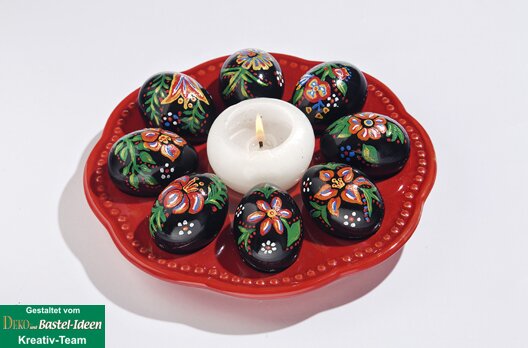 Lo spray déco nero costituisce la base perfetta e uniforme per la pittura espressiva di queste uova di Pasqua di ispirazione russa. I fiori sono stati prima stampati in bianco e poi colorati, conferendo al dipinto un ulteriore effetto tridimensionale.