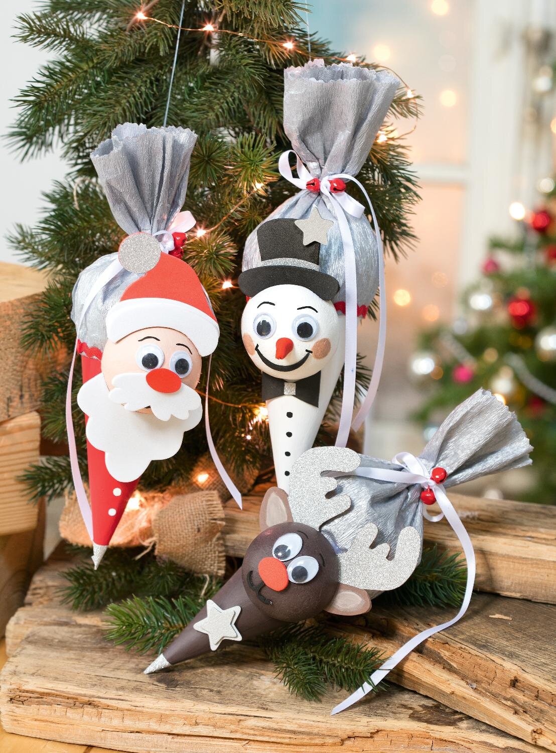 Utilizzando la sagoma del motivo , ritagliare il cappello, la barba e il naso dalla gommapiuma rossa e bianca. Incollare il cappello, i baffi e il naso con la colla per gommapiuma. Decorare il pompon del cappello a punta con un foglio di glitter autoadesivo. Non appena la palla di polistirolo si è asciugata, incollare il cappello e la barba alla palla. Posizionare e fissare gli occhietti e infine colorare le sopracciglia con un fineliner nero.