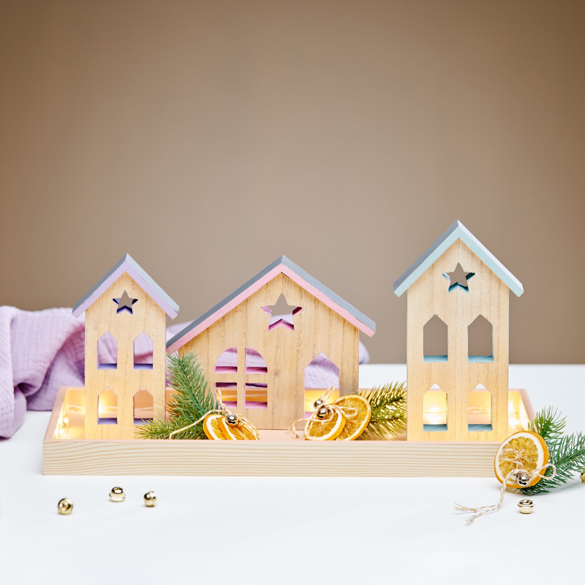 Se volete ricreare esattamente la nostra idea, usate i colori artigianali in polvere, rosa pastello, lavanda, verde mare e grigio pietra per dipingere i pezzi di legno. Dipingete con cura il bordo superiore del vassoio, i tetti delle case e i bordi interni delle finestre, delle porte e delle stelle con i diversi colori usando un pennello fine.