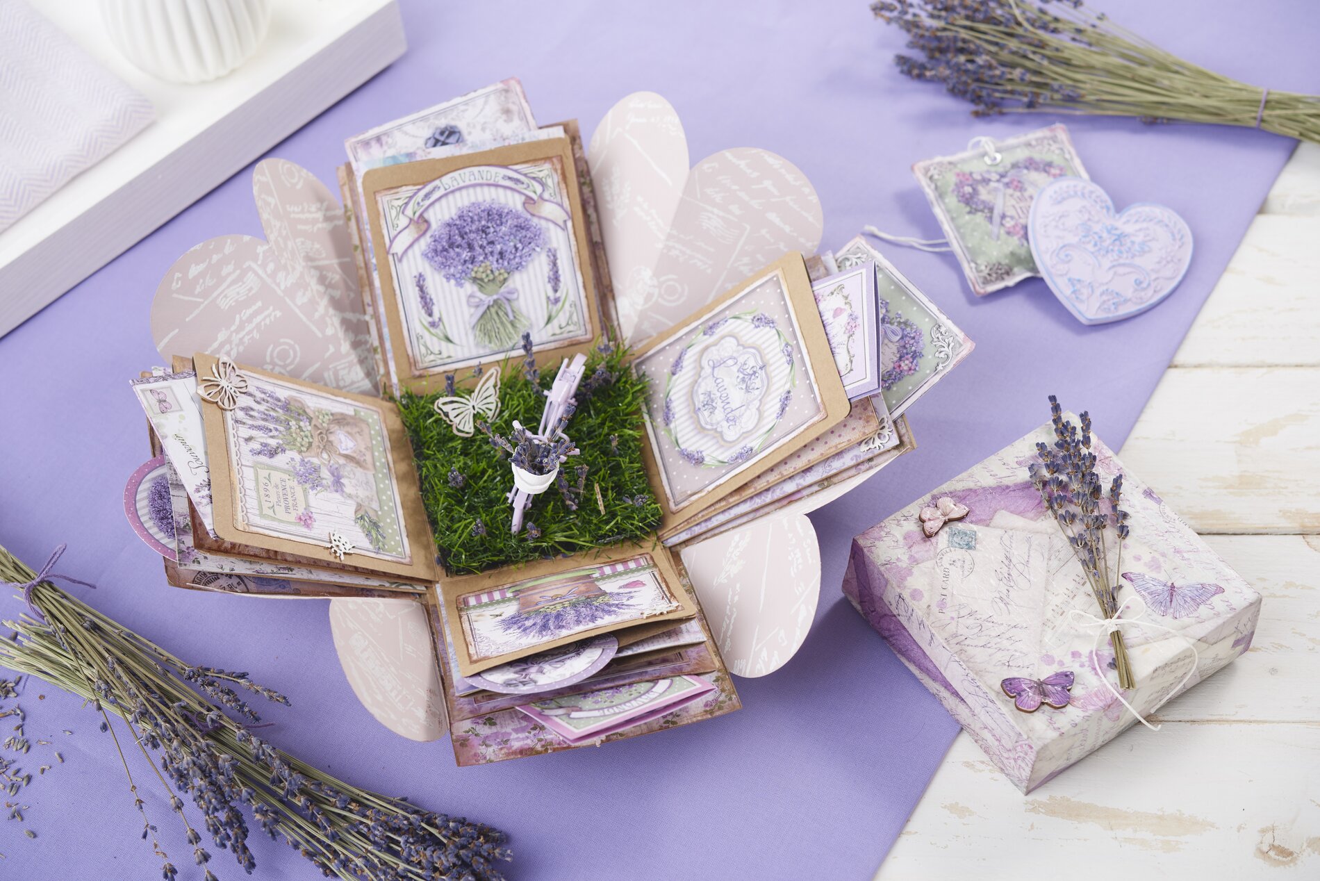 Al centro della scatola abbiamo creato un giardino accattivante con nastro d'erba ed elementi in miniatura. Per farlo, incollate il nastro d'erba al centro della scatola e completatelo con fiori di lavanda. La bicicletta in miniatura è stata dipinta a spruzzo in lavanda per adattarsi al paesaggio provenzale. Incollare la bicicletta nell'erba e decorarla con il secchiello del manubrio dipinto di bianco, fiori di lavanda e zuccherini.