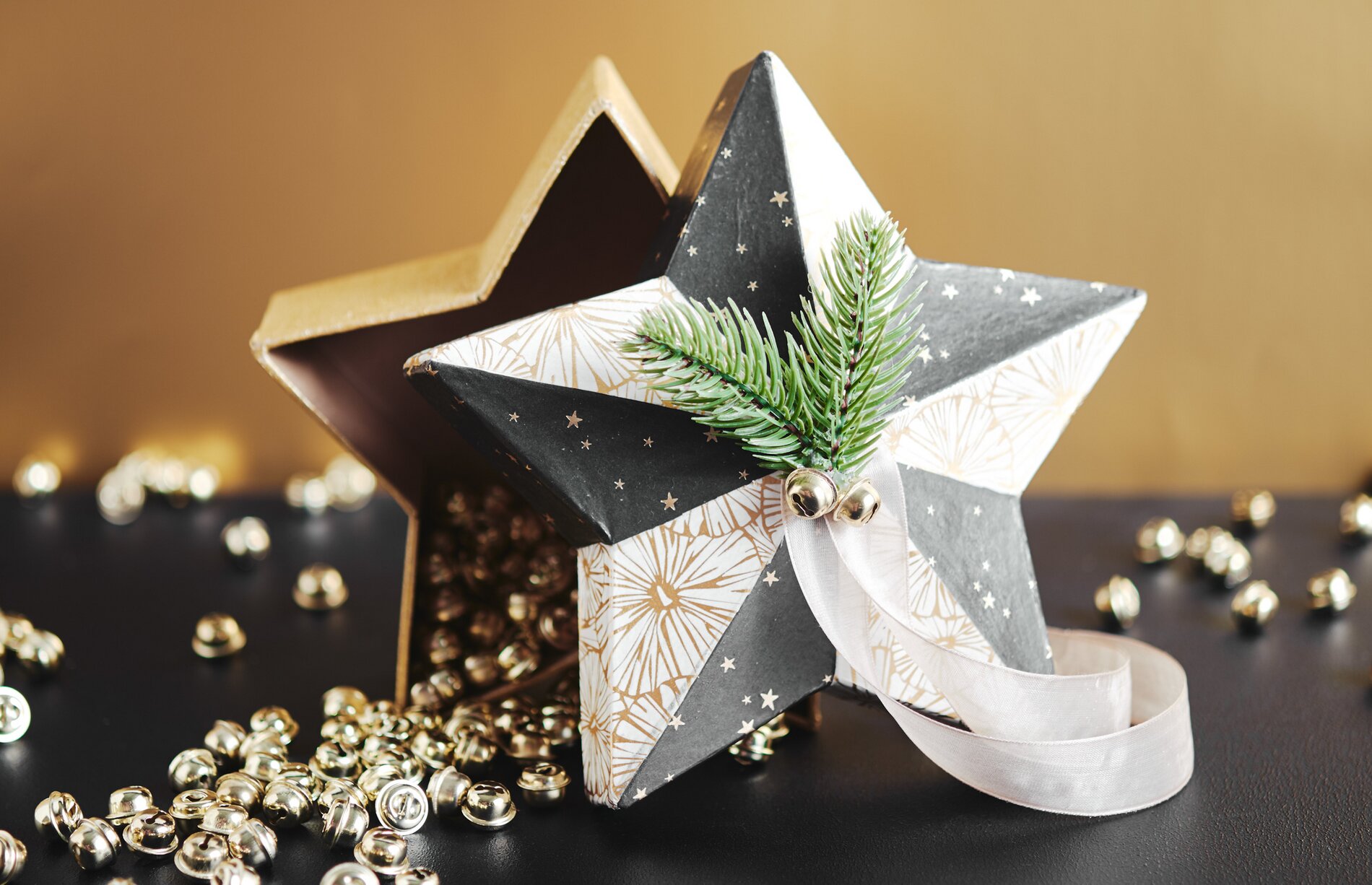 Rivestire le pareti esterne della base della scatola e la parte inferiore del coperchio con un'elegante vernice dorata. Infine, disponete sul coperchio un nastro, del verde abete e delle campanelle e fissate la decorazione con la colla.