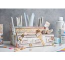 Questo portautensili mantiene in ordine il suo tavolo da scrittura o da lavoro. I 6 scomparti offrono spazio sufficiente per penne, pennelli, marcatori, righelli, forbici e molto altro. Disegni la scatola secondo le sue idee con vernice acrilica, colori Chalky, pittura a lavagna, seta di paglia o tecnica del tovagliolo. Lasci che la sua creatività si scateni e disegni il suo organizzatore personale.