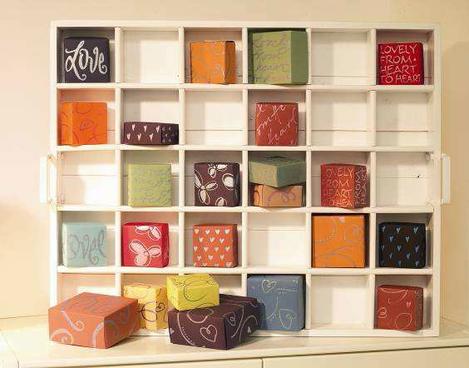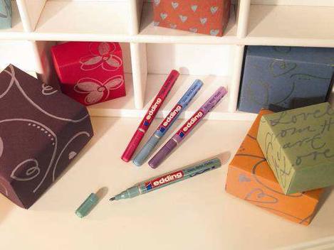 Ora disegnate semplici motivi o parole sulla carta con il pennarello per pittura lucida. I ritagli di ciò che avete dipinto appariranno in seguito a causa della piegatura.