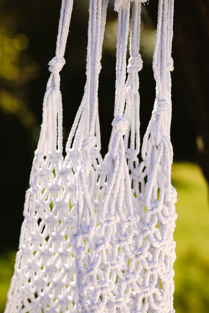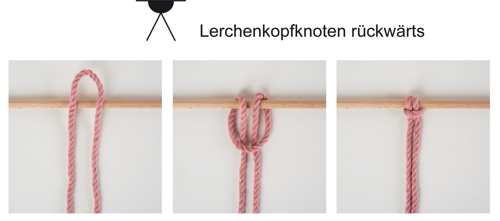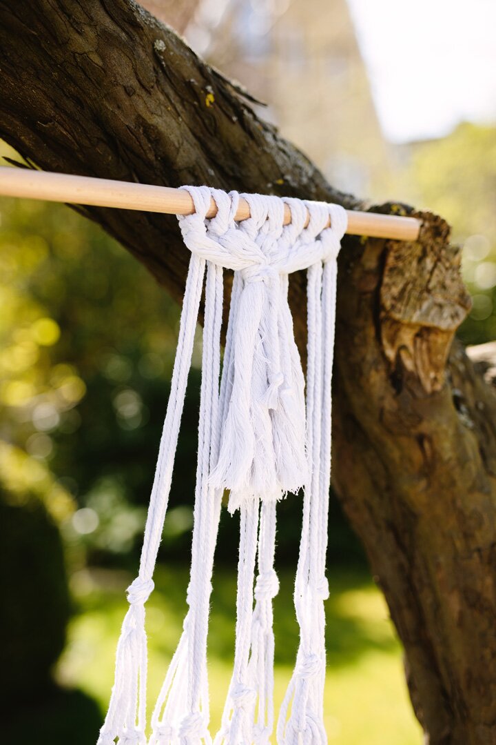 Tagliate 28 fili di corda lunghi da 250 cm a 300 cm (a seconda della lunghezza della sedia). Far passare sempre due dei cordoncini attraverso quattro nodi a testa di allodola aperti (questi sono gli anelli di sospensione originali quando si legano i due pezzi singoli). Annodare saldamente i cordoni.