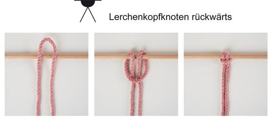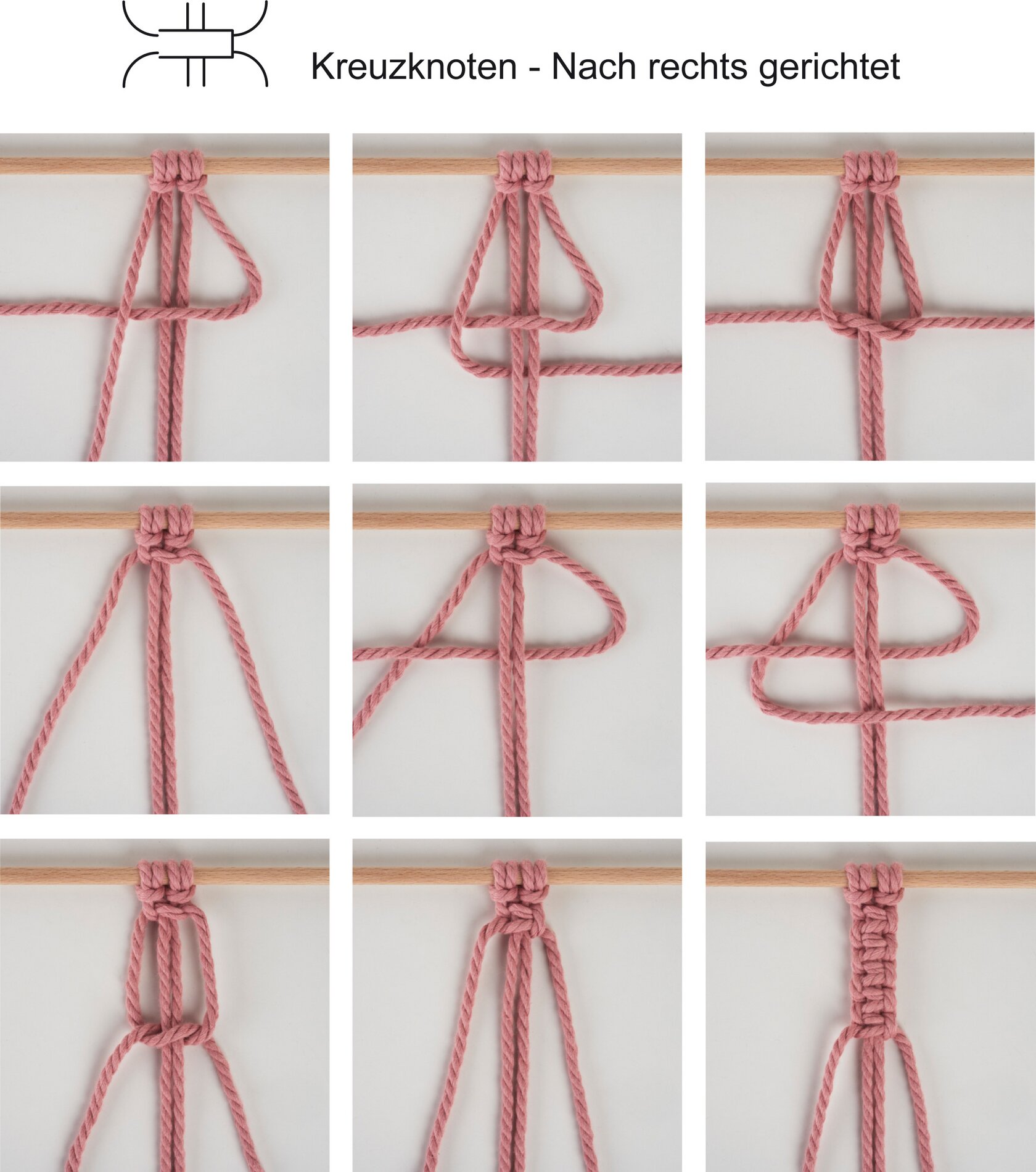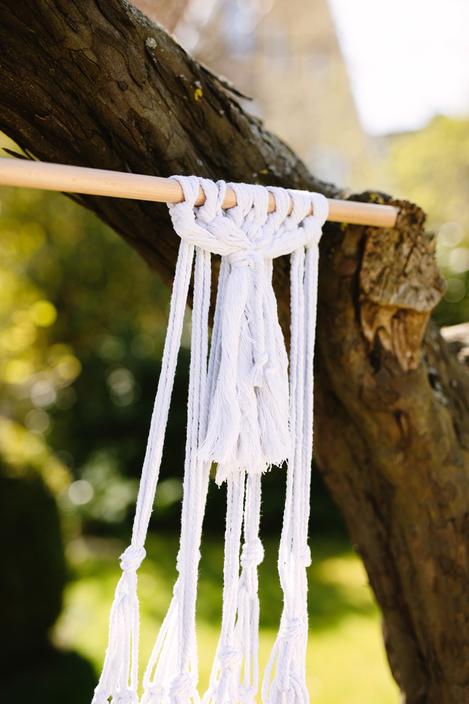 Legare ogni singolo cordone in modo molto stretto (con diversi nodi) all'asta di sospensione. Infine, pettinate tutte le estremità del cordone e legatele insieme a un altro pezzo di cordone per formare un nodo decorativo.
