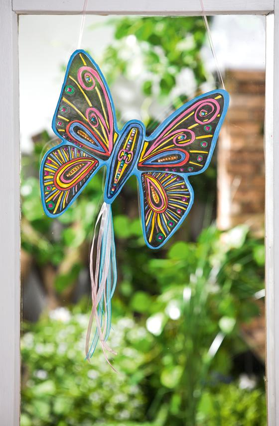 Utilizzare la colla a caldo per fissare una sospensione in nastro d'organza, annodare più nastri insieme e incollarli alla base della farfalla.