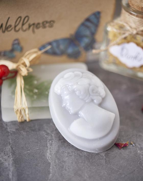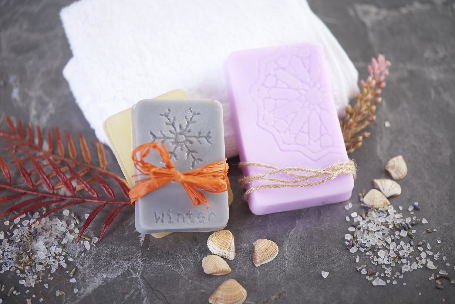sapone bianco per colata ecologica e aggiungere il colore del sapone. Nel nostro esempio di decorazione, abbiamo optato per il grigio pietra e la lavanda. Versare quindi il sapone fuso negli stampi. Lasciate asciugare bene il sapone liquido e rimuovete con cura le saponette finite dagli stampi. Le linee elastiche del